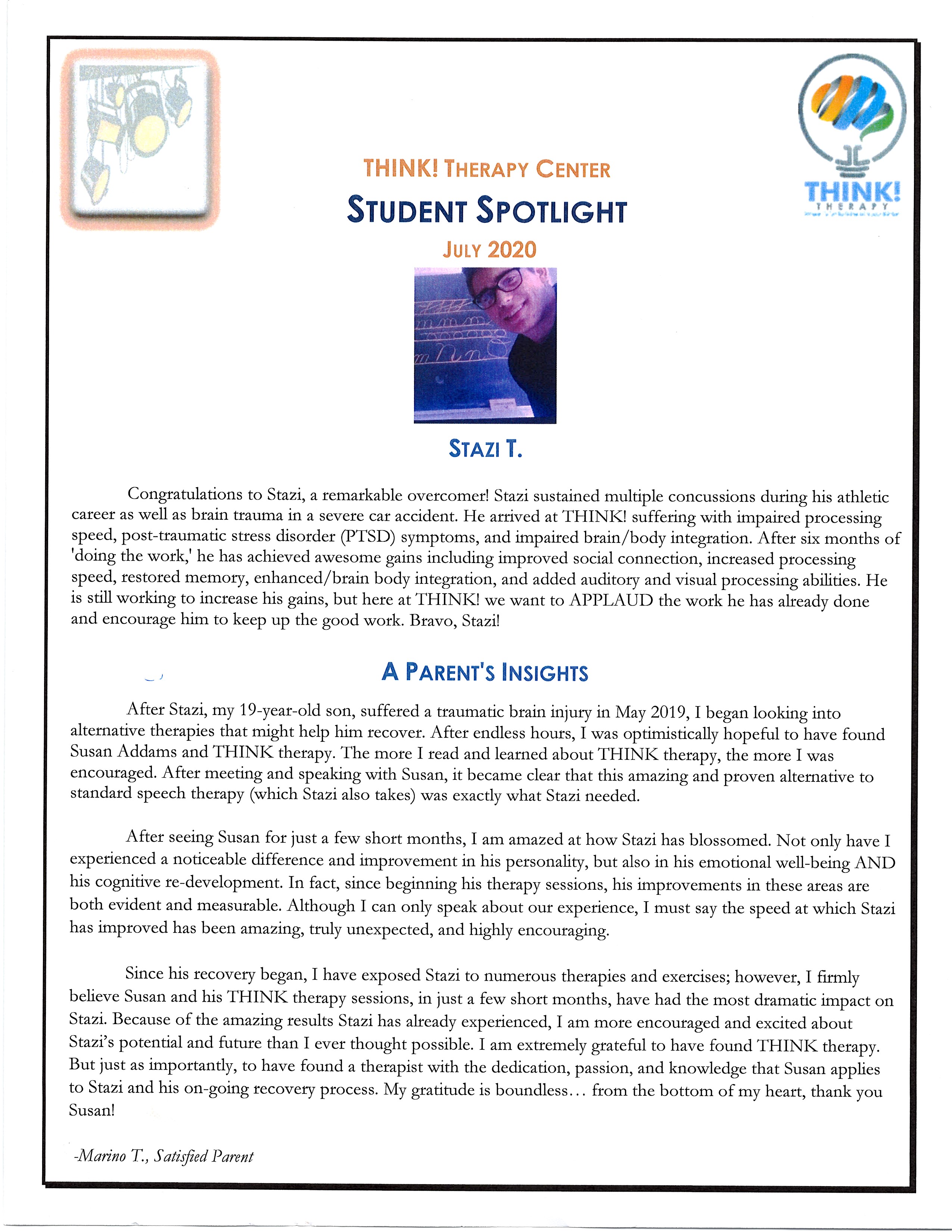 "After seeing Susan for just a few short months, I am amazed at how Stazi has blossomed — not only in his personality, but in his emotional well-being AND his cognitive re-development. The speed at which Stazi has improved has been amazing, truly unexpected, and highly encouraging. I am more excited about Stazi's potential and future than I ever thought possible. My gratitude is boundless… from the bottom of my heart, thank you Susan."